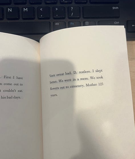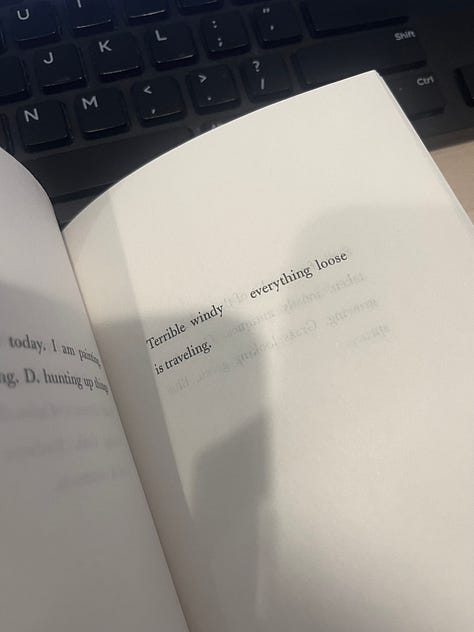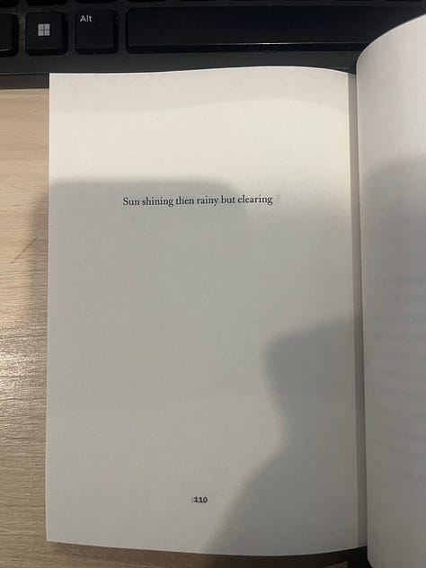 The book is composed like a diary throughout the seasons, clearly the product of a culling process, a whole year filtered into these sparse selections. It’s (sort of) interesting to consider what one would choose from a much larger aggregate of material to make into a book of this scale. There’s a tone of both sensitivity and pragmatism; it gradually becomes evident that this is a story, among other things, about illness and caretaking (to which sensitivity and pragmatism are equally fitting), not merely seasons but a season of life. Likewise the brevity of the entries is perhaps appropriate to or representative of how one experiences, witnesses, documents infirmity