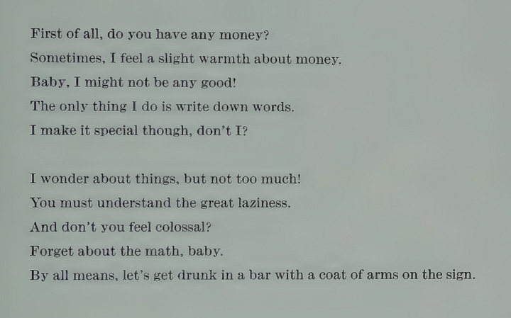 So good, with collections of poetry (also short fiction) I’m increasingly concerned that the pieces together feel like a complete work, seems like a low bar yet too often not the case... loved Baby, I Don’t Care for its parts and also as a successful whole. Perhaps not a huge demand because the form is relatively simple and consistent throughout
