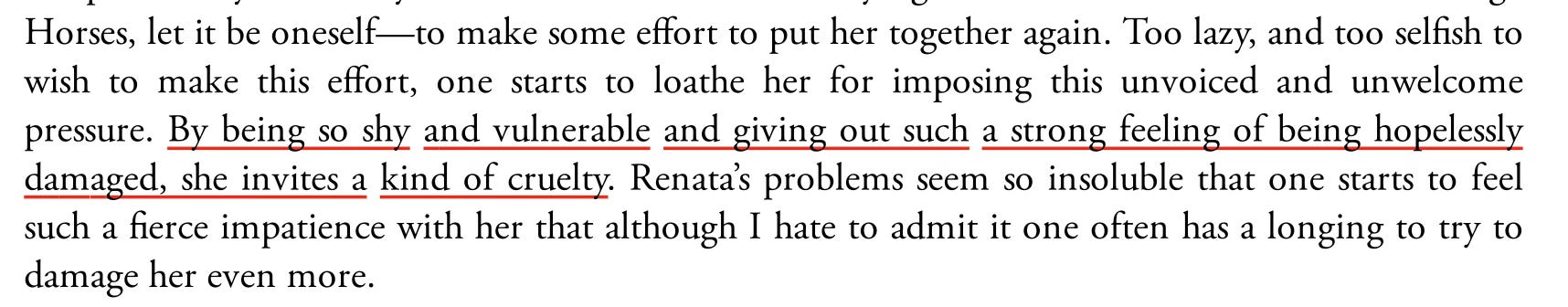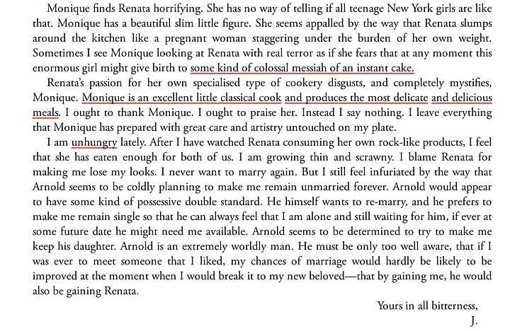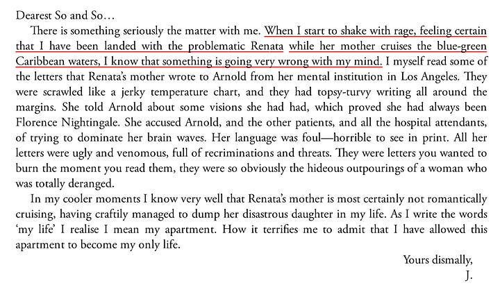 Hiji, if you’re reading this I meant to send you a voice note about this book, not only because the introduction mentions the Hotel des Artistes… read this completely randomly and very glad, like, I’m laughing recalling it; an epistolary novel, however, the letters are not written but instead rattled off in the mind of the narrator, J, to no one in particular (Dear So and So). J is a housewife in her thirties whose husband, Arnold, has abandoned her in their swish Upper West Side apartment for some jeune fille in France. But this is not the sole source of J’s misery. No: Arnold has left J with his daughter – her stepdaughter, The Stepdaughter – Renata, a morbidly obese, borderline mute teenager, whose pitiful nature inspires inexhaustible frustration, even fury, in J.