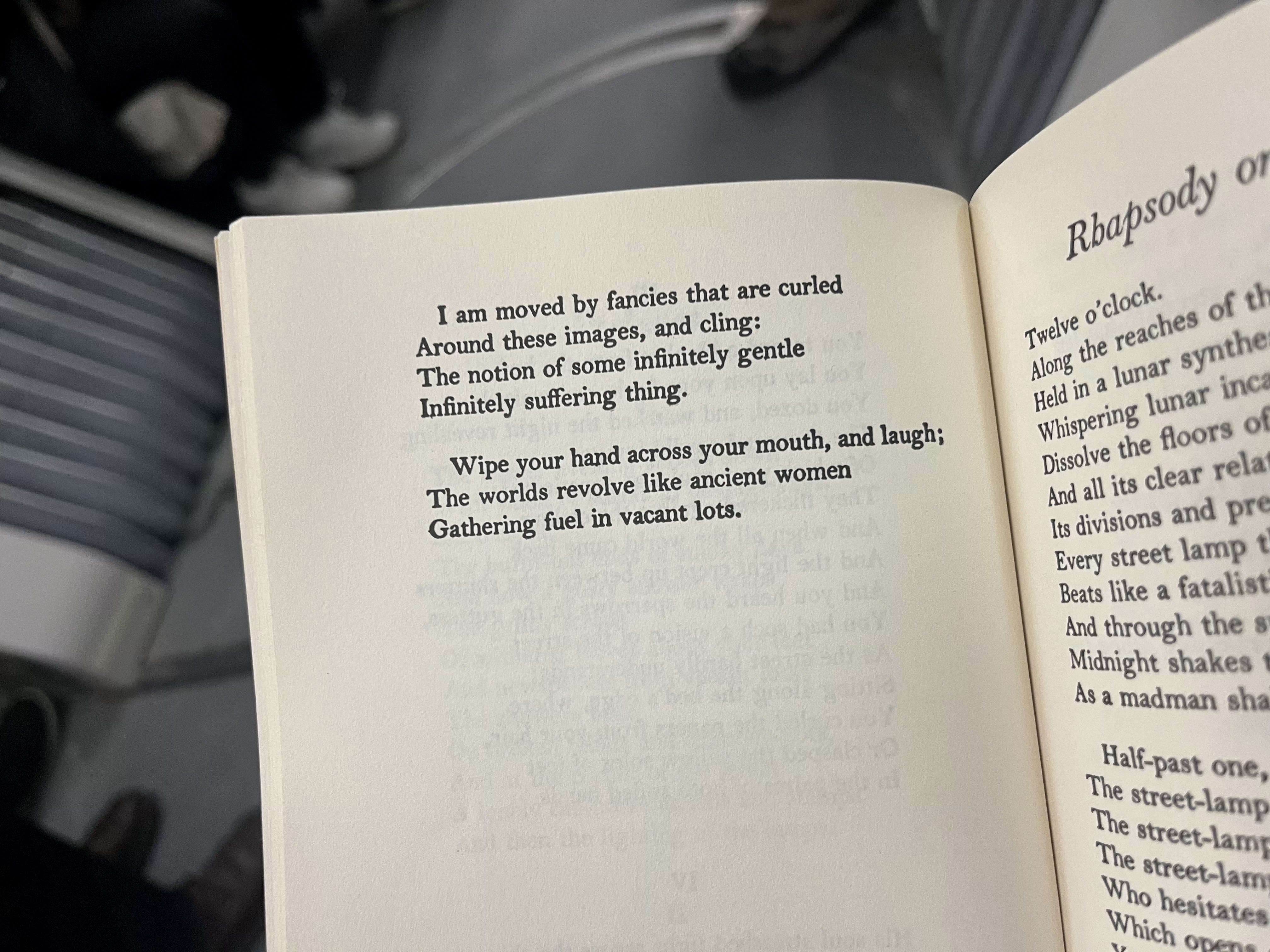 Last, though, closest to the heart: tradition that me and Olivia read The Waste Land aloud this time of year; I guess it’ll be over the phone. No opening lines like April is the cruellest month, breeding / Lilacs out of the dead land, mixing / Memory and desire, stirring / Dull roots with spring rain… tearing up in 3, 2, … bye